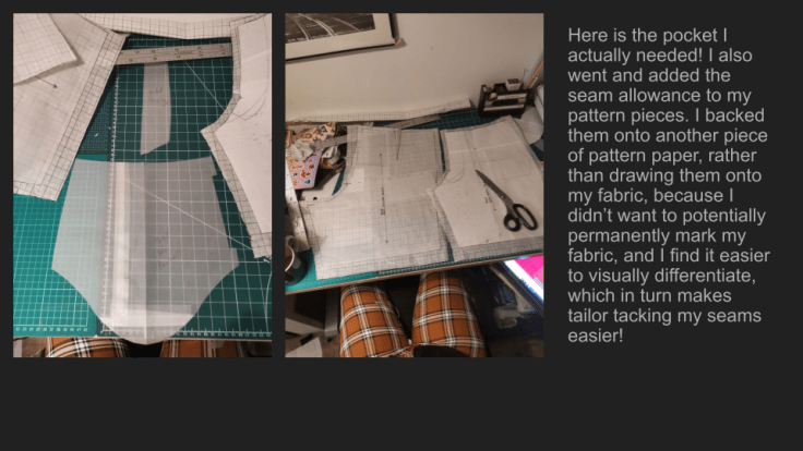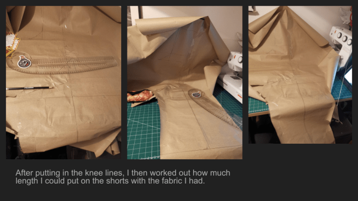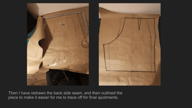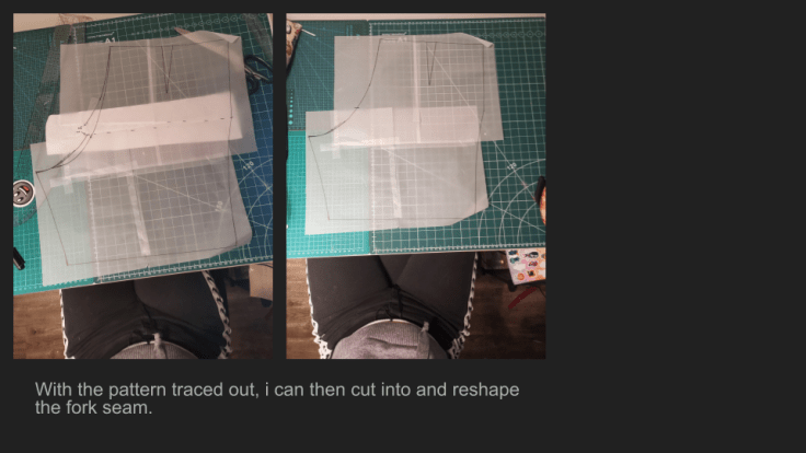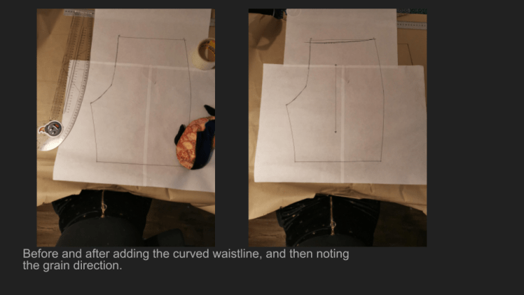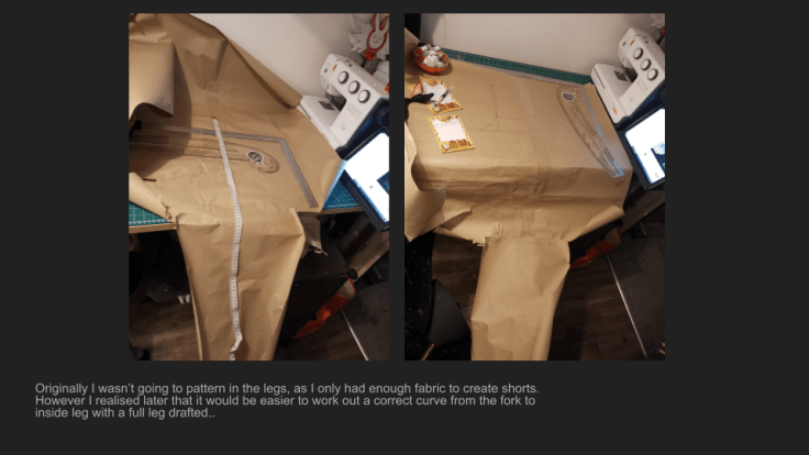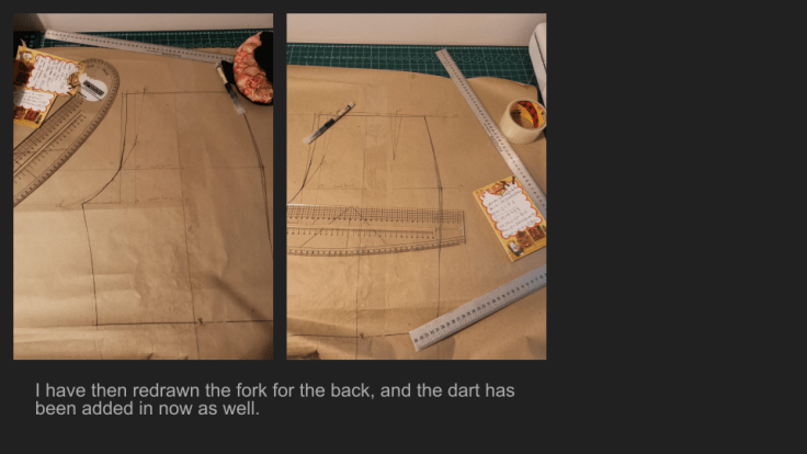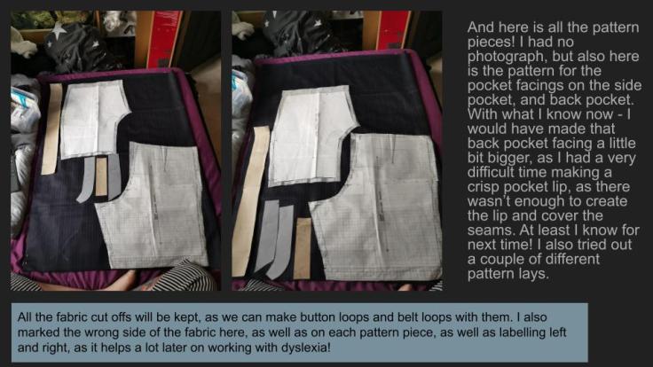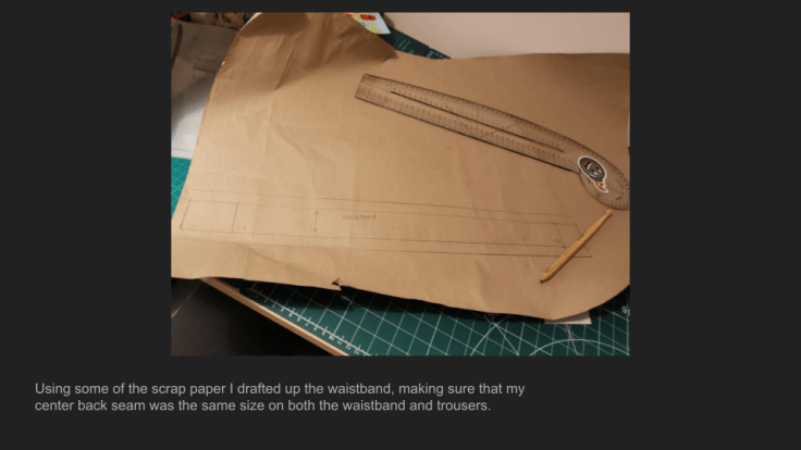 Also the seams on our trousers are different than Winfreds – While her pattern has a 1cm seam allowance all around, and no hem, I need to have bigger seam allowances to allow space for tailoring to thee performer or actor. Espeically prominent is the centre back, where we have a 4cm seam allowance at the waistband, which gives me wiggle room when fitting to a person.