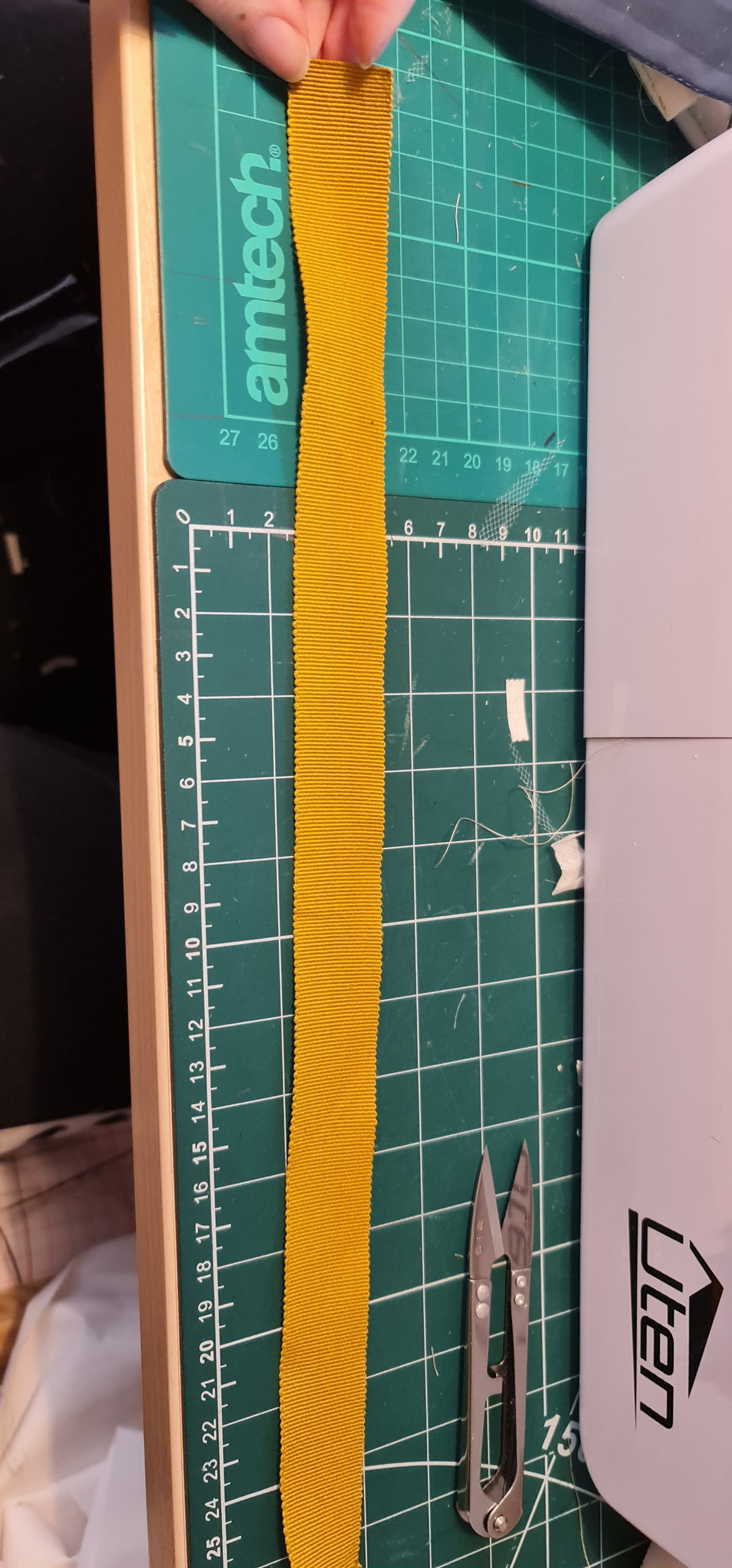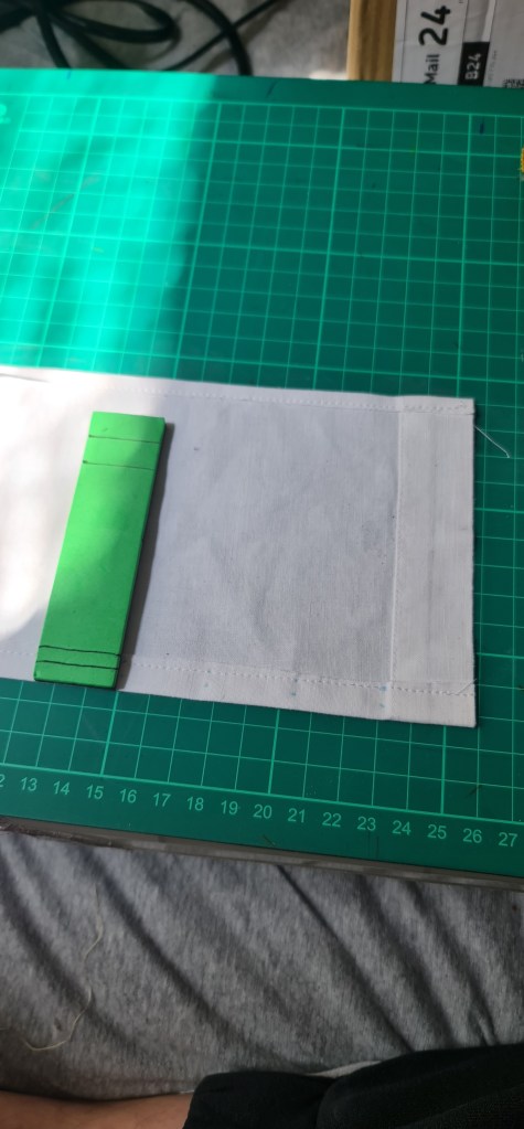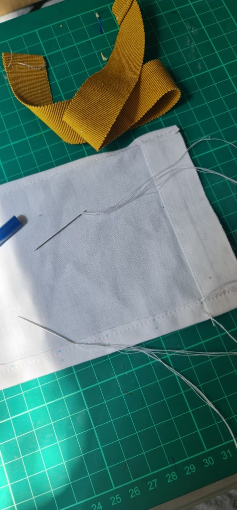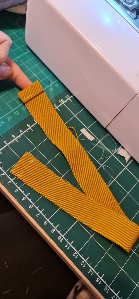 I was a little worried about how this process was gonna go, as you have to be pretty precise. I had the foresight though to make a tool to help me with this step! I have this magnet that is the same width as my petersham. I then marked out 0.5cm twice, and thats where my stitch hole markings will be placed! This way I know that the piece will always be the same width and placement every time, rather than worring about making sure it matched using a ruler every time. After marking along my fabric, using a fabric marker of course, on the wrong side, then comes the long part. Armed with two needles, with 4 threads each, it’s time to pleat. I found this step theraputic, even if it was time consuming. I bunched a small bit first, and held it to my petersham to make sure its the right size, and it turned out almost perfect!