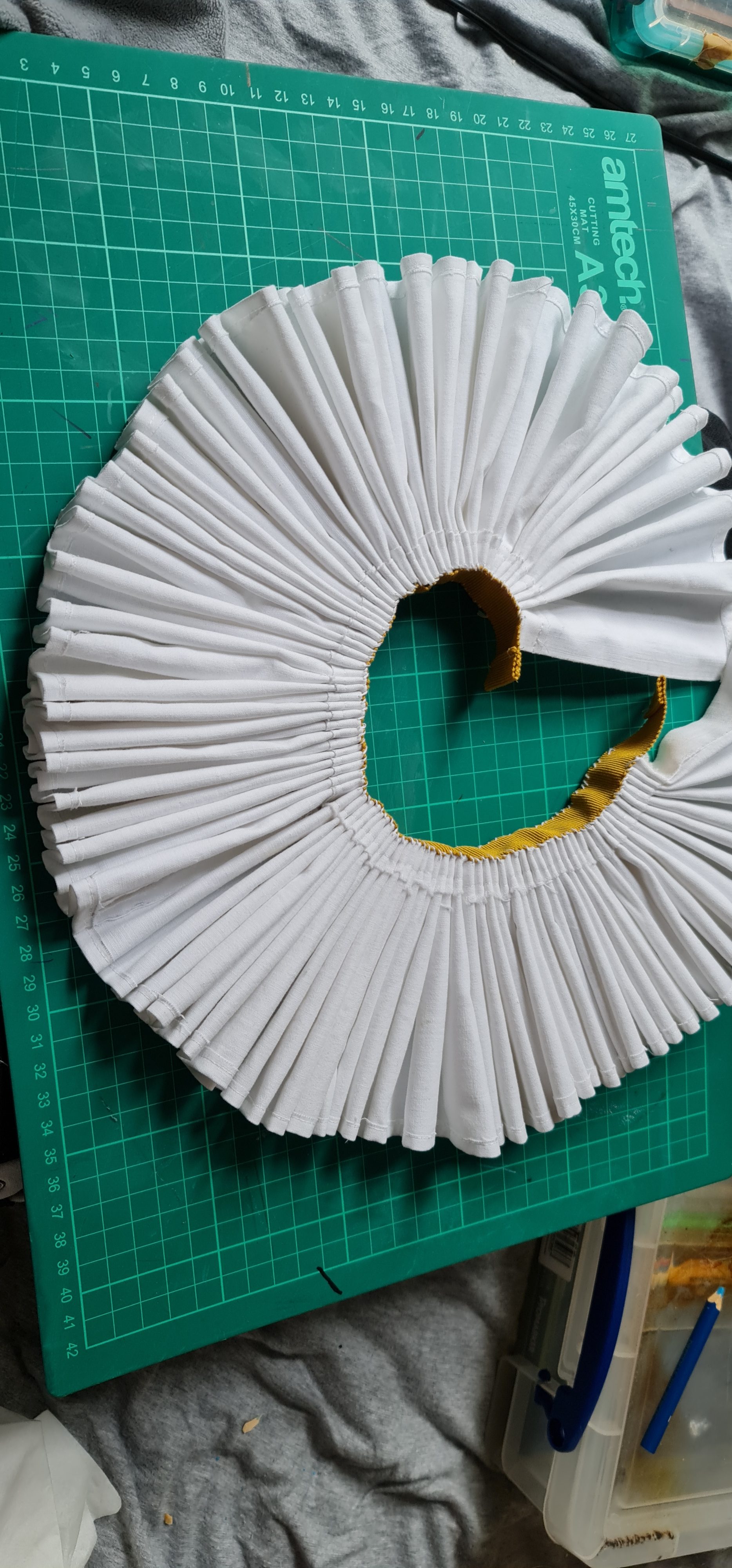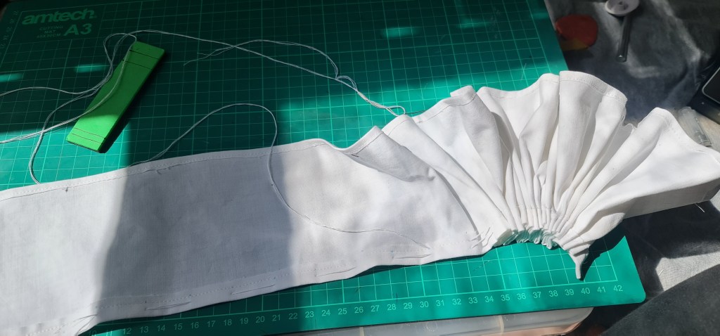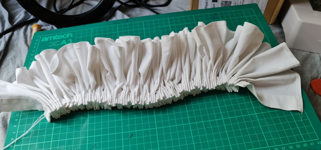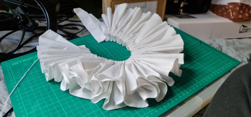 For the ruff itself, you don’t actually need much fabric – 1 meter is more than enough to create a decently sized ruff, as you can cut off many strips, espeically if its only 10cms deep. I did add seam allowances though! 1cm on the side that will be stitched onto the neckband, and 2cm on the other side to create a rolled hem.