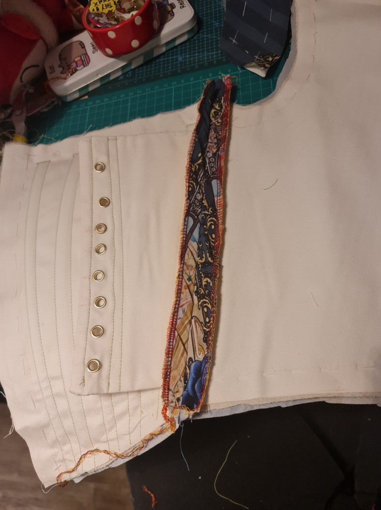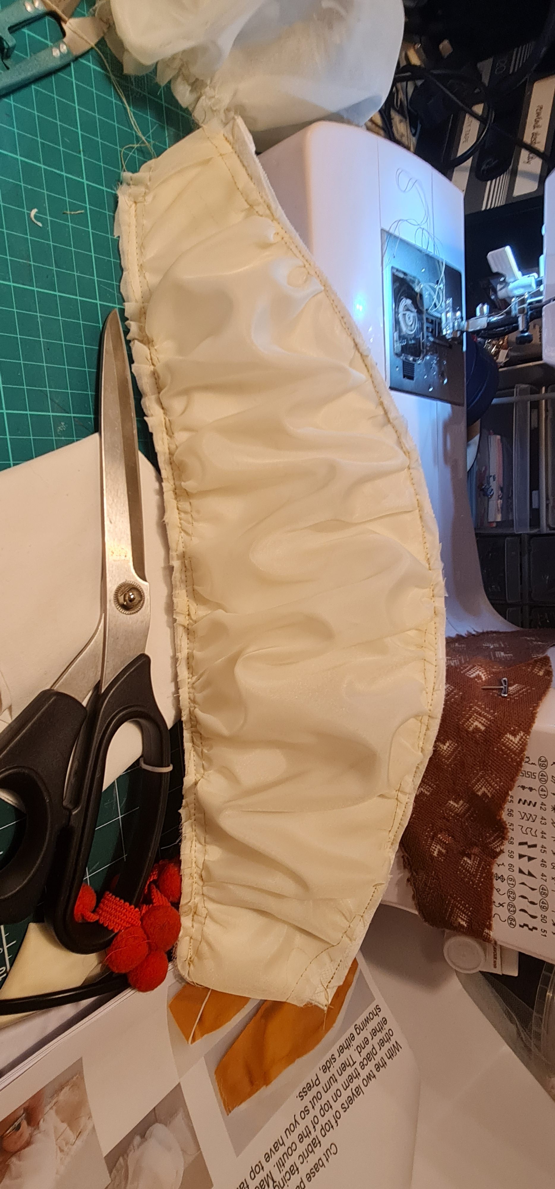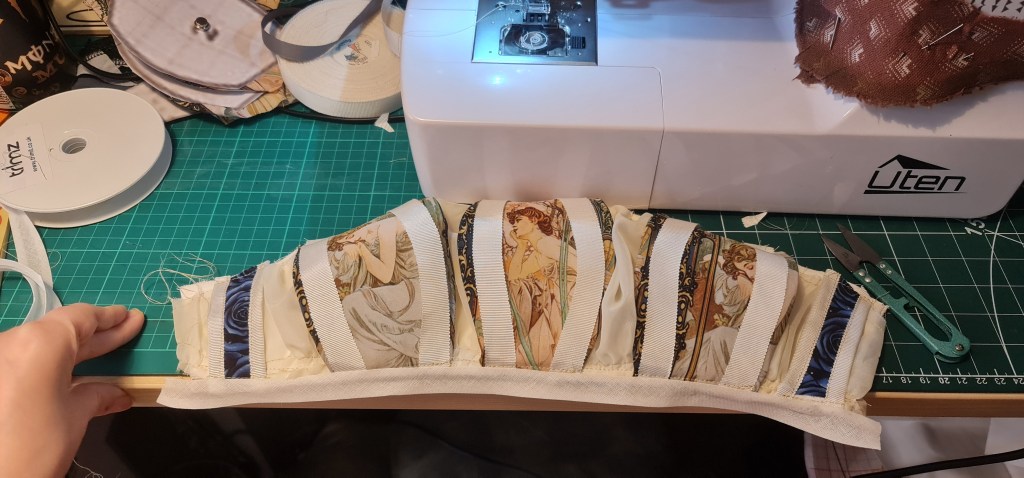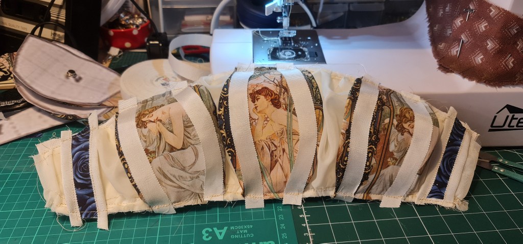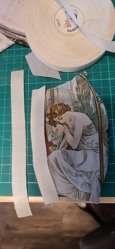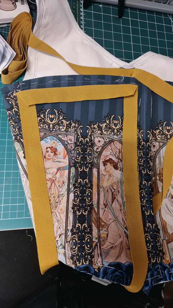 The shoulder panes… Or window panes as I like, were a little tricky, and I did have to re-do a couple as they didn’t sit quite right. I used coutil as backing, as per the instructions I had, but I think I would pick a slightly softer fabric next time – the coutil was just a smidgen too thick. Here you can see the petersham i decided on as well – I really like how the white complimented the lady’s outfits, rather than the dark mustard colour. I was trying to play with complimentry colours (opposites on the colour wheel) but I just wasn’t feeling it.