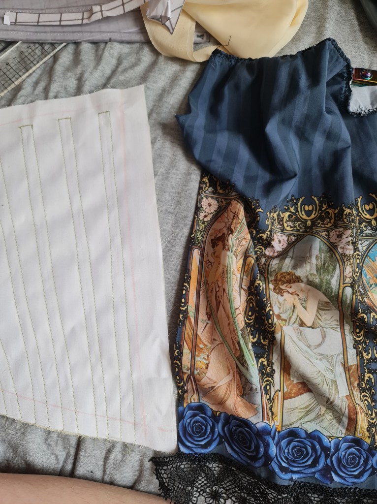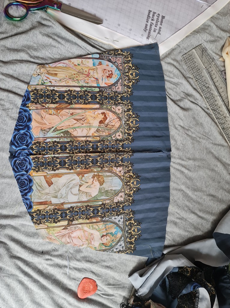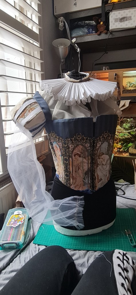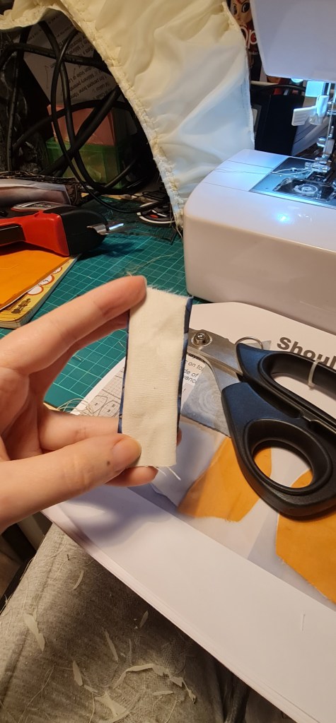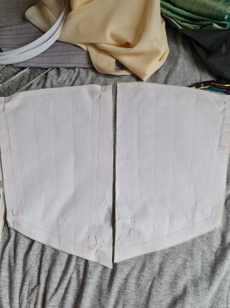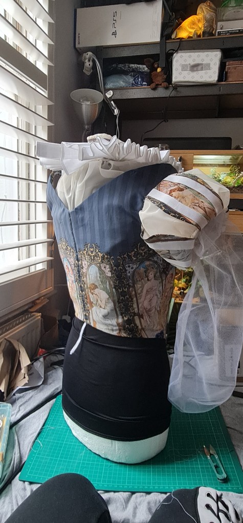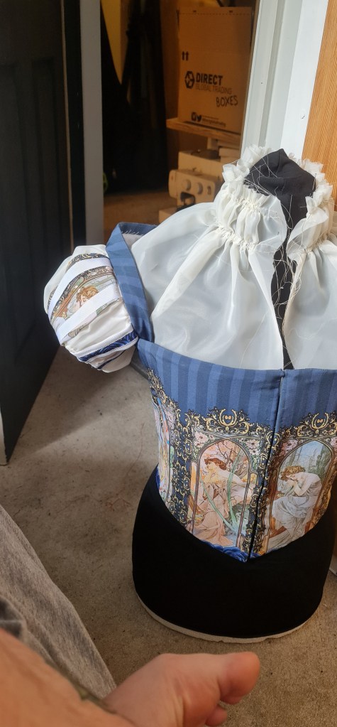 The shoulder panes… Or window panes as I like, were a little tricky, and I did have to re-do a couple as they didn’t sit quite right. I used coutil as backing, as per the instructions I had, but I think I would pick a slightly softer fabric next time – the coutil was just a smidgen too thick. Here you can see the petersham i decided on as well – I really like how the white complimented the lady’s outfits, rather than the dark mustard colour. I was trying to play with complimentry colours (opposites on the colour wheel) but I just wasn’t feeling it.