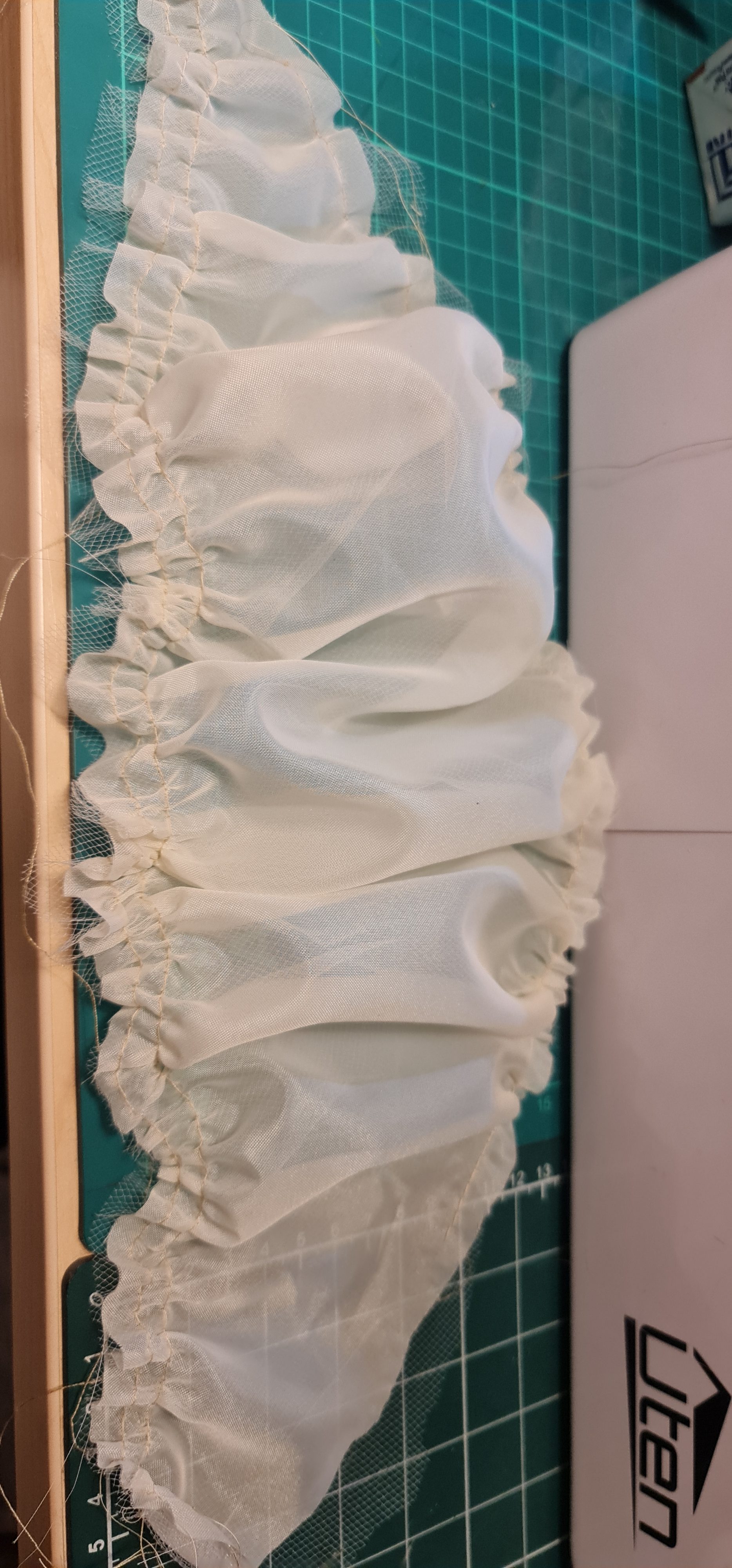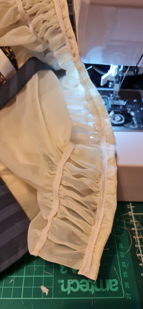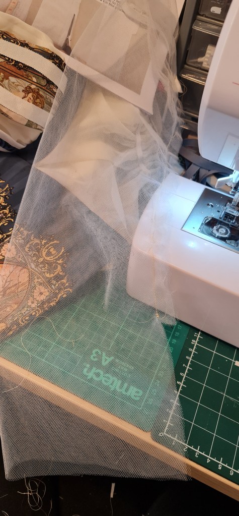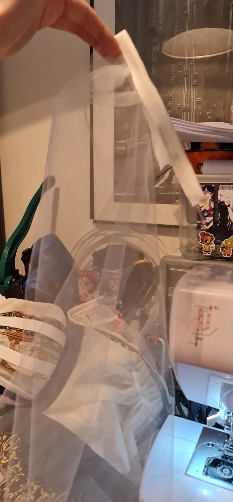 Epaulette time, babey! I had a lot of fun making these – they are just *so* extra, espeically once I put on what I’ve called “window panes” over the layers of tulle and voile. Quick note here though – I had polyester voile arrive instead of cotton voile. If I were to make this again, I would absolutely pick cotton instead. The polyester is bouncey, and a little weird looking. I think I got it looking managable in the end, but I do not recommend buying poly voile.
