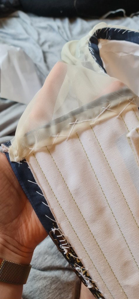 For awhile, I debated not adding the petersham here too, however, it just looked… not quite right with out it. I then bias binding the top and bottom, and herringbone stitched them down on the inside. From here on out, I only start finishing one side of the bodice – that is what is needed for the tech skills marking, and I started running out of time to do both sides. I think it could have been done, but I didn’t want to be panicking last minute. I will return to this to finish it off though, as I really love how it’s turning out, and I absolutely want to send it to a photographer to get some super fancy photos.
