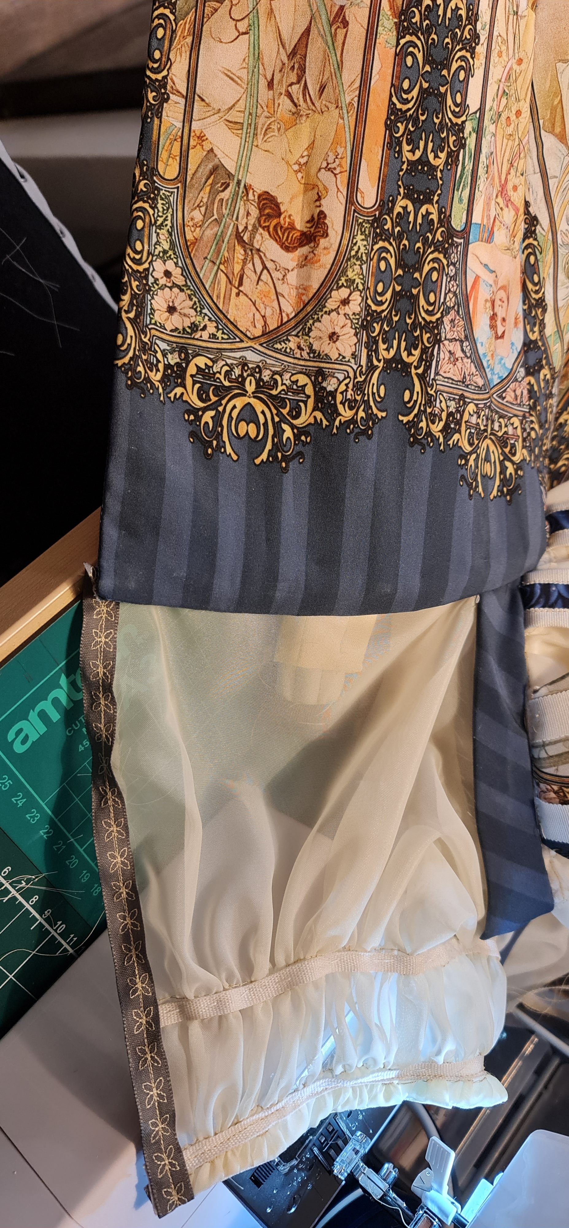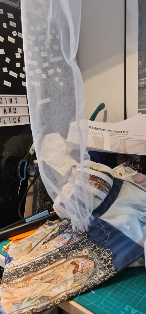 This part was difficult to photograph, as the dress net is so fine and soft. I bias binding the top of the sleeve, so that this piece can be tacked into the epaulette, and then changed later. After that, I began a french seam, leaving a space for the sleeve plackets. For the plackets, its a simple rolled hem, and then finish of the french seam to finish! I am tempted to try this sleeve again, with the voile, just to see how it looks.