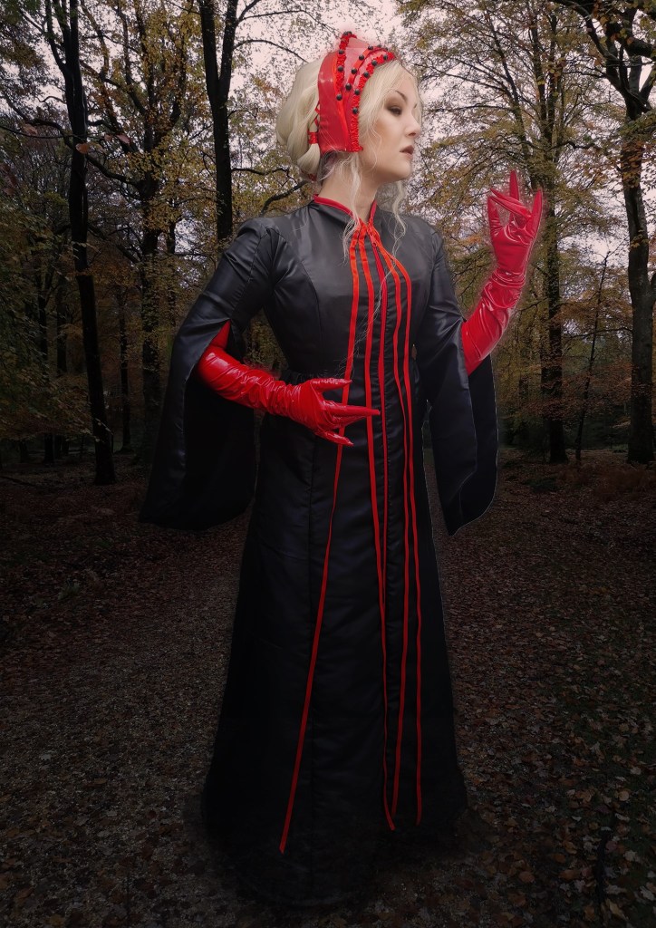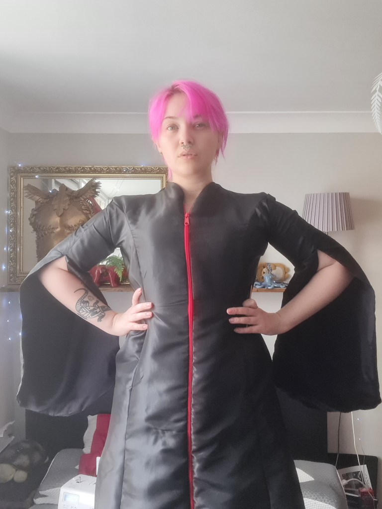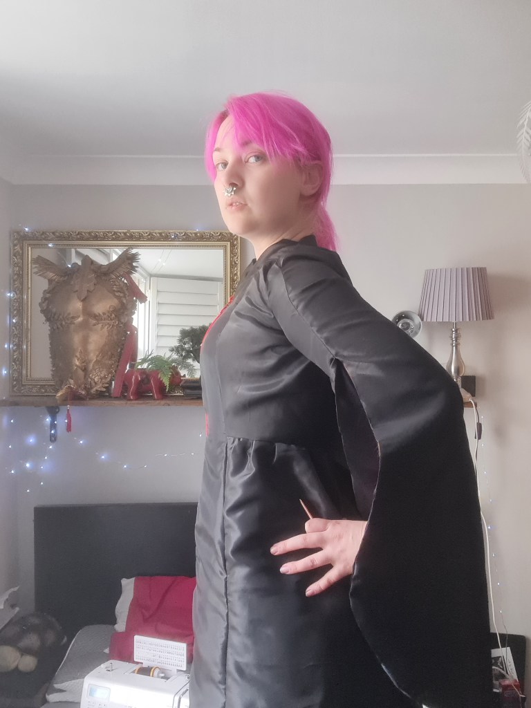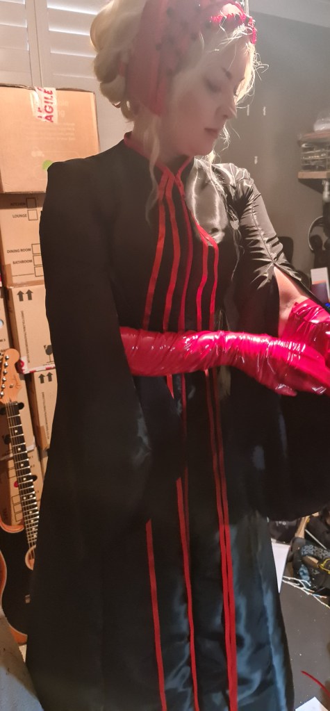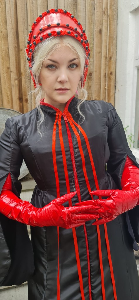 And there is the final results! Overall, I’m pretty happy with how it turned out, and I do think it represents its source materials. The taffeta ends up looking quite slick, and I joked about how I look like I’ve made a Handsmaid Tale outfit combined with The Matrix. If I could do it again, I would maybe try a more matte fabric to see how it looks against the PVC and latex. I love the full length zipper for the middle stripe – it worked better than I imagined. I definitely would make the arms a little wider, and add that zipper in for the gloves. I would retry the headpiece with PVC as well, as I think that would be easier to work with than the latex, but I wanted the experience working with latex.