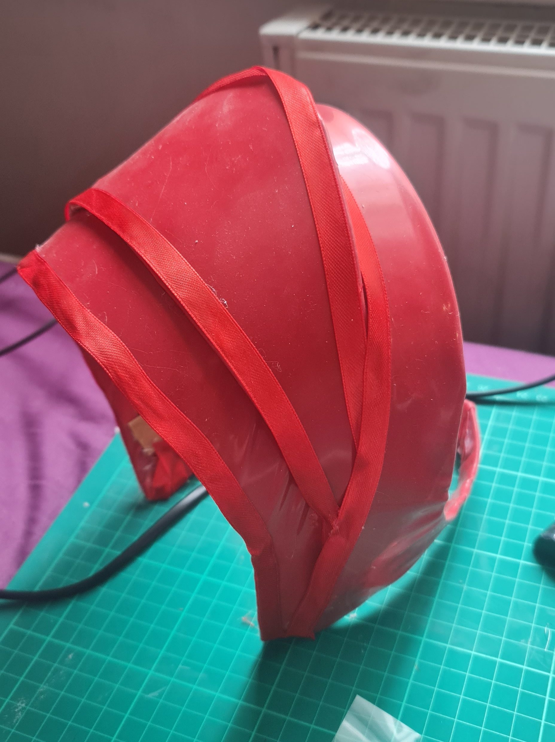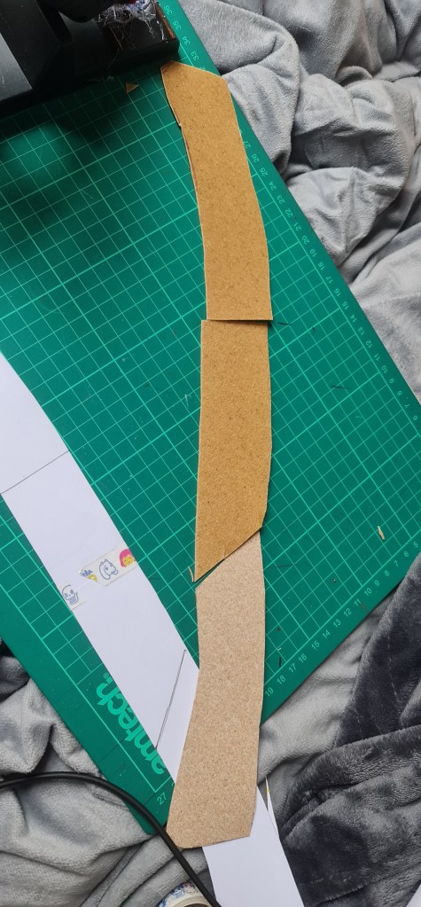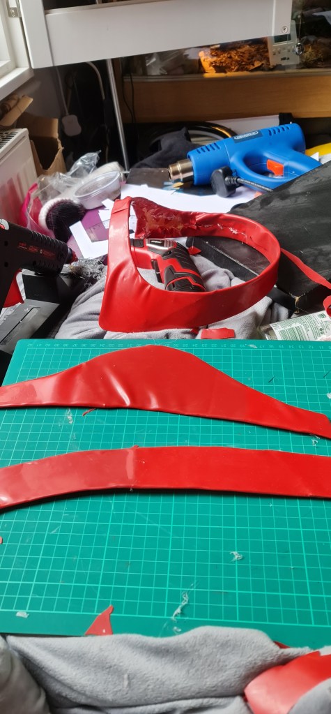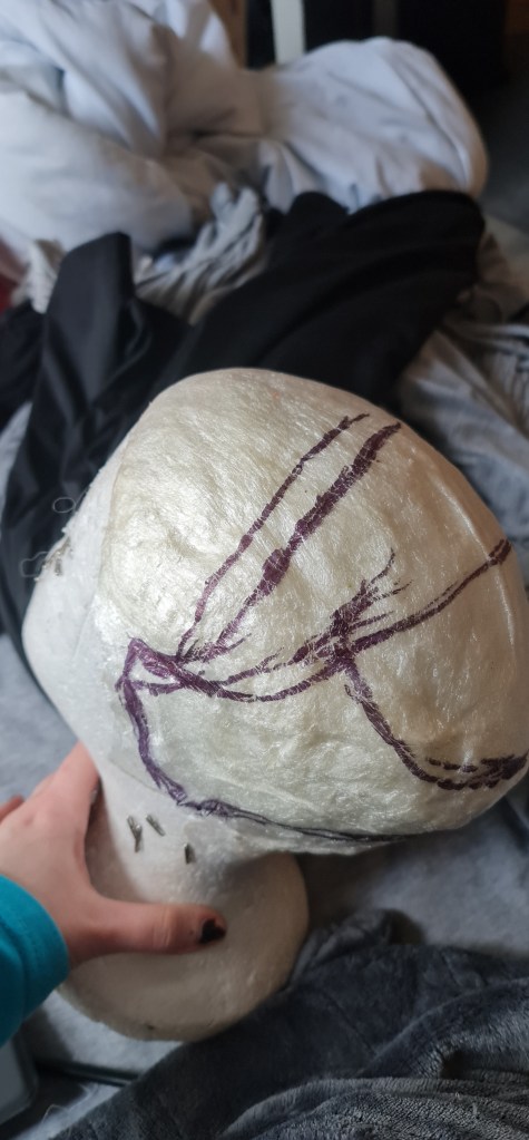 So I ended up using this pattern that I found online. While it’s not exactly the same shape, it is close enough and a more traditional shape than what I had created, so I believe it’ll still look good. I used worbla as a base, and shaped it with heat and moulding it over the mannequin head.