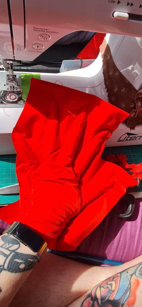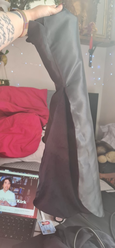 As I didn’t want there to be visible hems on the cape sleeves, I cut out two, stitched around the sleeve upto where I joint the front and back together, and then bagged it out. From there, I stitched the sleeves together, turn rightside out, and voila!