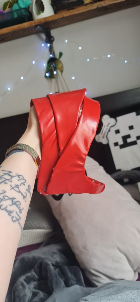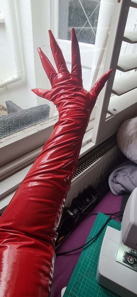 For the gloves, I used the PVC instead of latex. After talking with my tutor, and doing some reasearch, there is a couple of reasons why. One being that there are quite a few people with a latex allergy, and two being the style glove that I wanted, the fingers needed to be moulded, which wasn’t an option availble to me. I found 4way stretch thin PVC though, and I love how this looks. It ends up twisting and gnarling around the arm, which I think looks suitably witchy.
