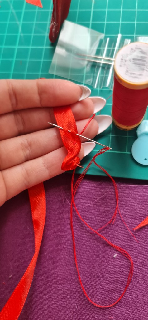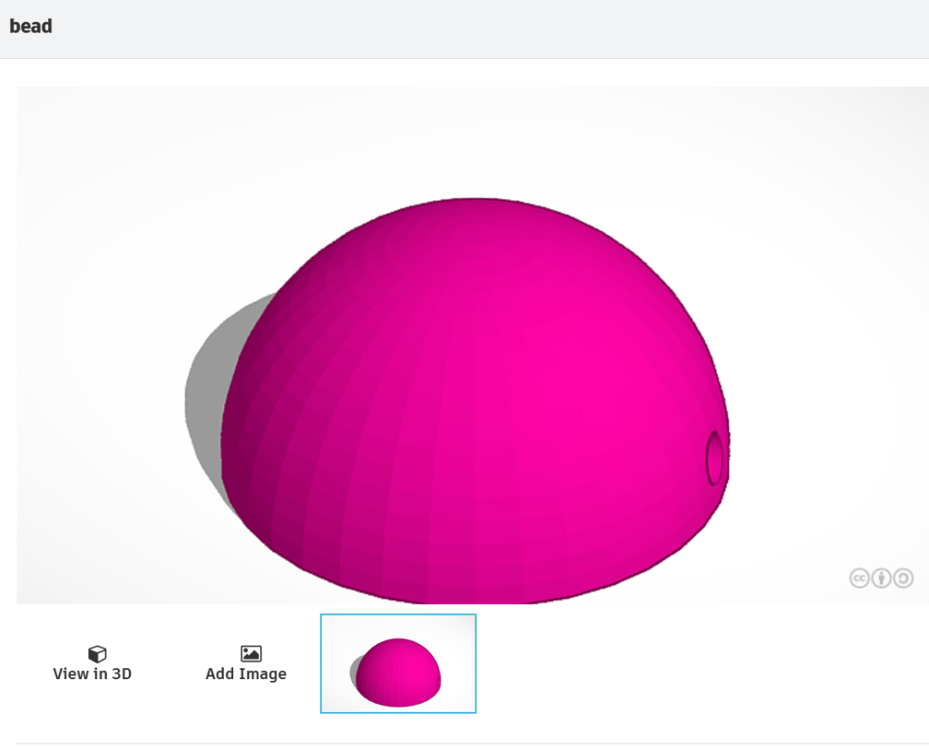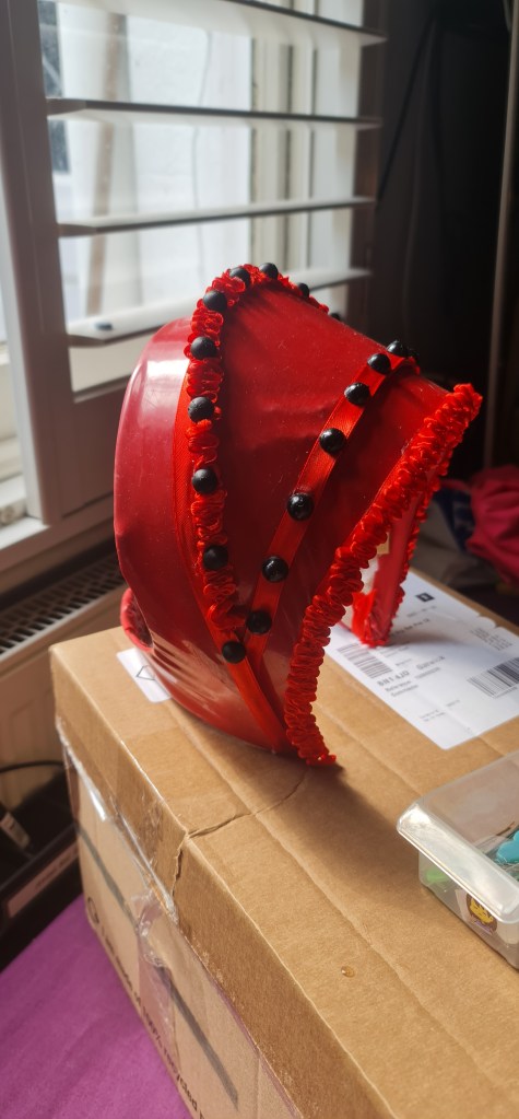 I decided I wanted to make my own beads, as they are just plain black on the reference image. I opened up tinkercad, and made a simple half dome shape, with a tunnel towards the bottom so I can stitch them though. I then 3D printed them, and spray painted them black! I made them 1cm x 1cm, so they would be the same size as the decorative ribbon.