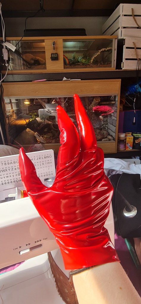 Heres the gloves! While I am happy with them, there is definitely a few changes I would do for future use – They are tricky to put on and off, espesically quickly, so it would be no good for a quick change performer. To rectify this, I would put and invisible zipper into the inside arm, shown in the the second picture.