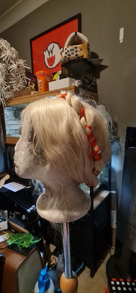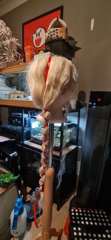I had a blonde with ready to style up – The design doesn’t really show much of the hair, just that it’s blonde, and looked tied up. I found a great tutorial online while doing research that showed how peope would have tied their hair up in Tudor paintings – Hair ties as we know them today wouldnt have existed, but lots of people made use of ribbon!