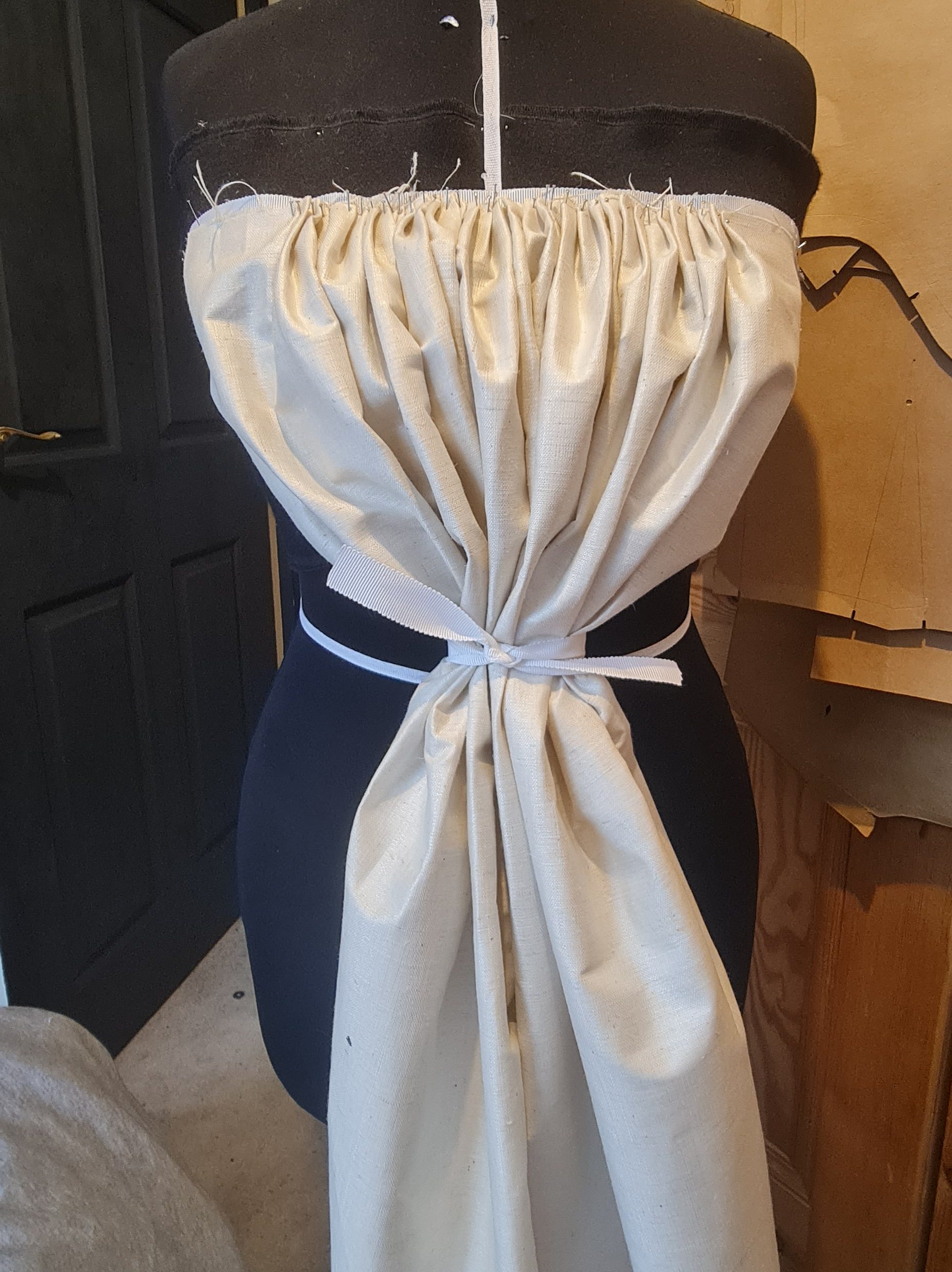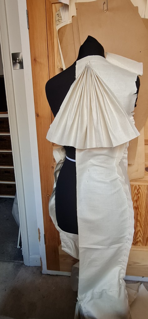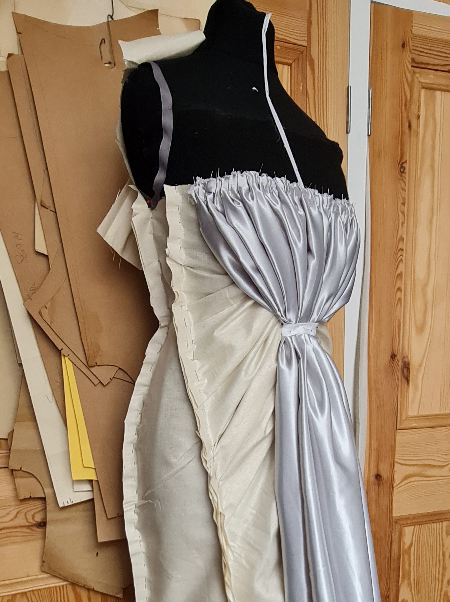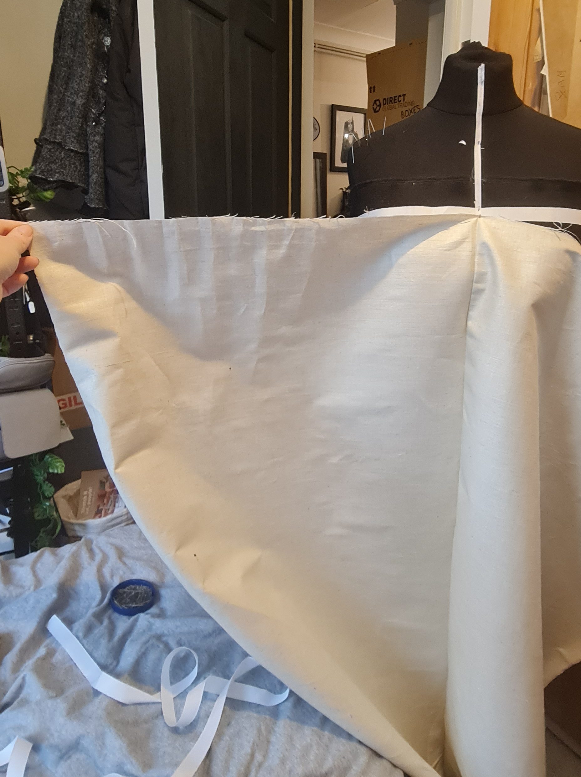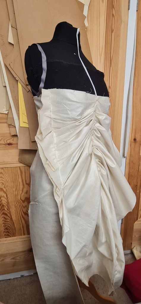 I started with the front draping first – I hadn’t quite figured out yet how I was going to be able to the dress underneath, but you’ll see what i did in the end! I done the toile with this kind of stiff cotton – Later I switched this out for a lighter fabric, as this was just a little too stiff to see it was going to flow the way I wanted it too.