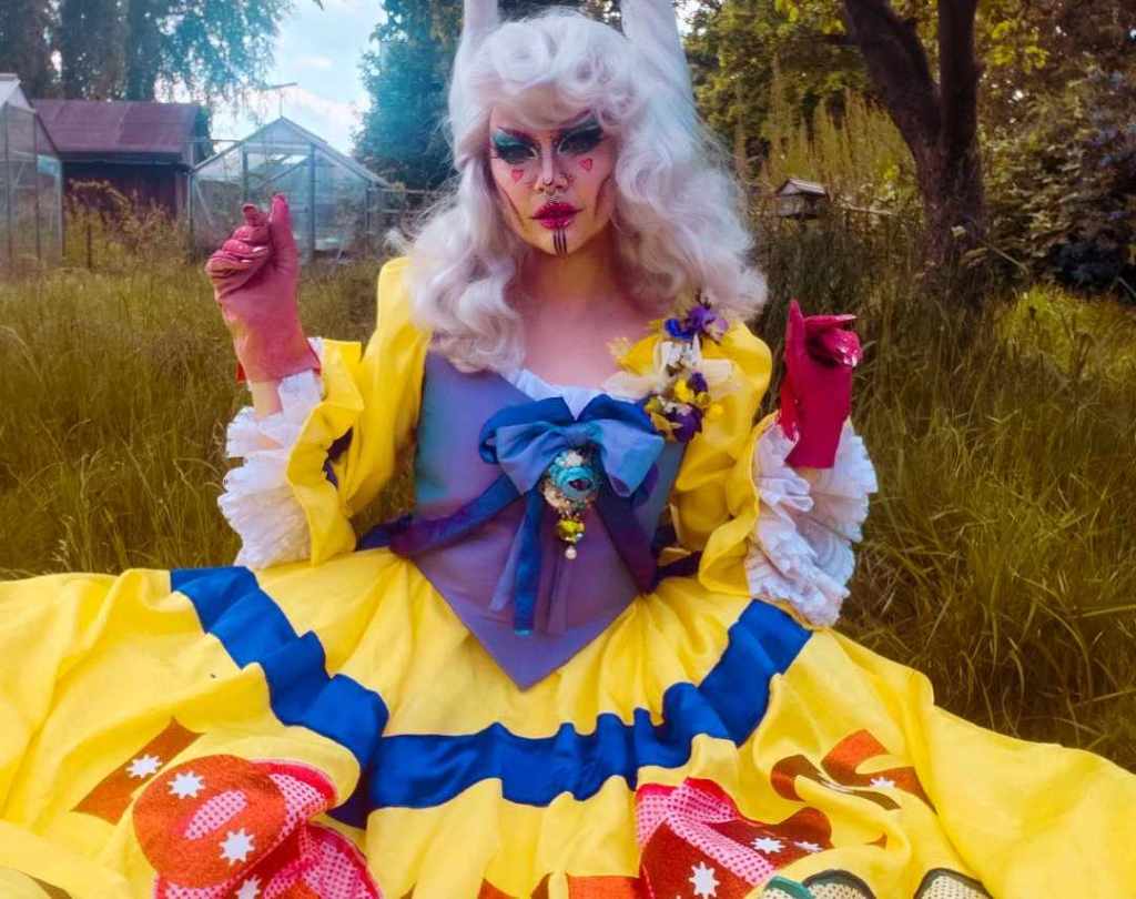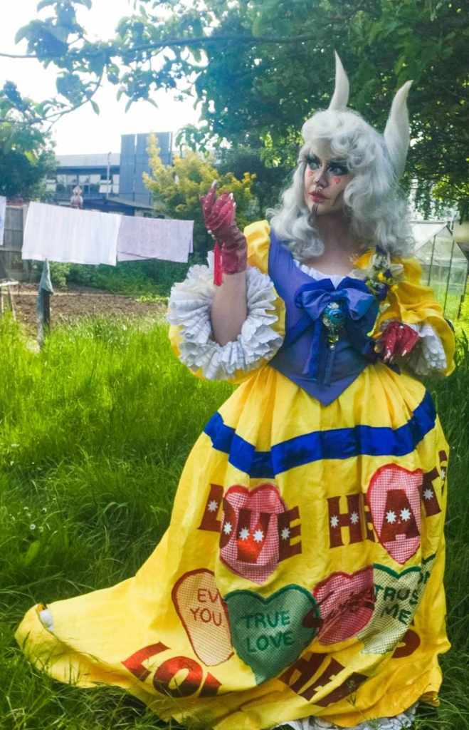 Made from lots of different fabrics to create unique textures and colours; A two-shot Taffeta for the bodice, and faux dupion silk for the sleeves and skirt. I recycled some old net curtains to create the frills around the arm holes, as well as the petticoat underneath. The wording is a mixture of appliqué and vinyl transfers. The wig is also styled by myself. I wanted a more campy, drag aesthetic, and so worked with a drag artist for the final result.